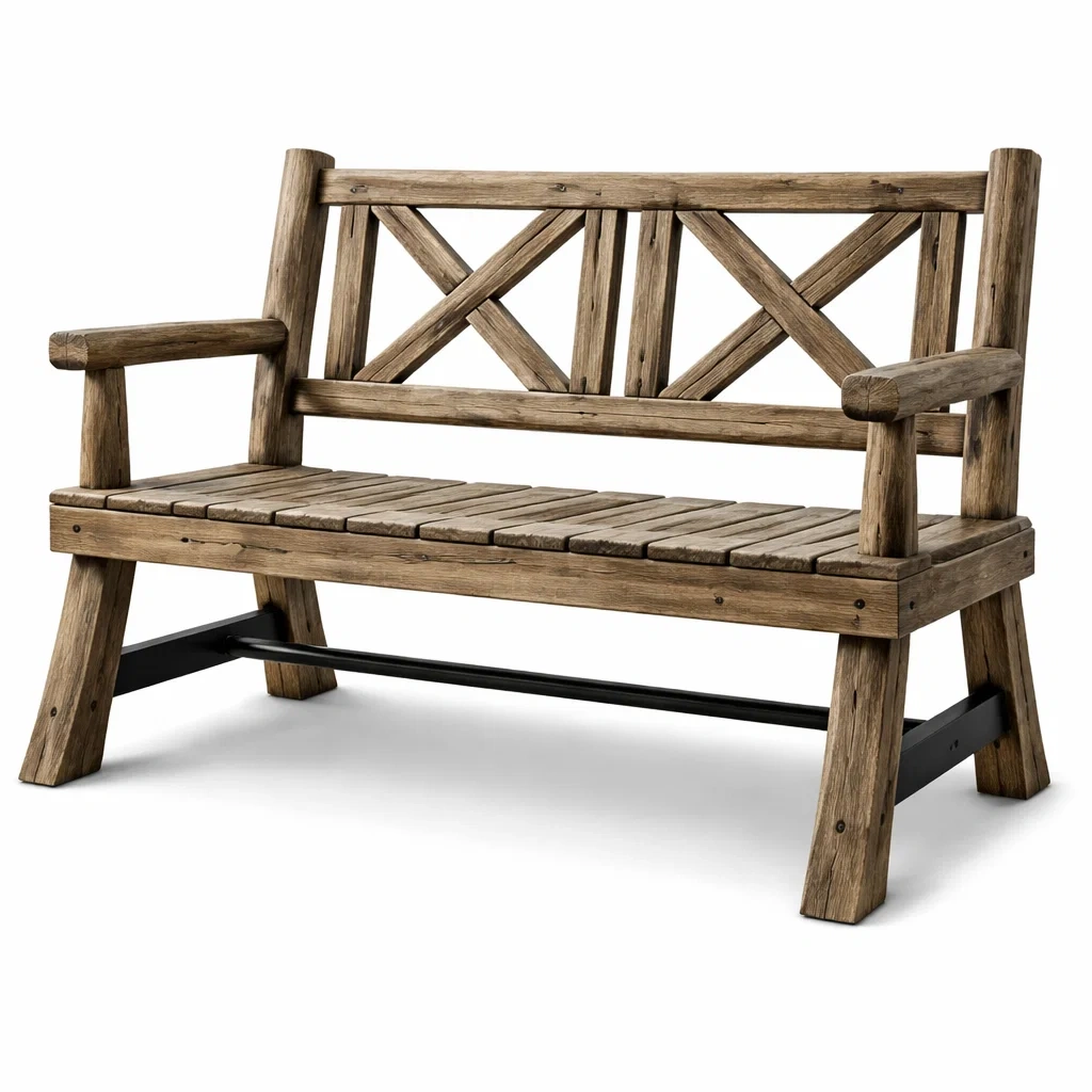Banc de jardin en bois et acier avec dossier croisé