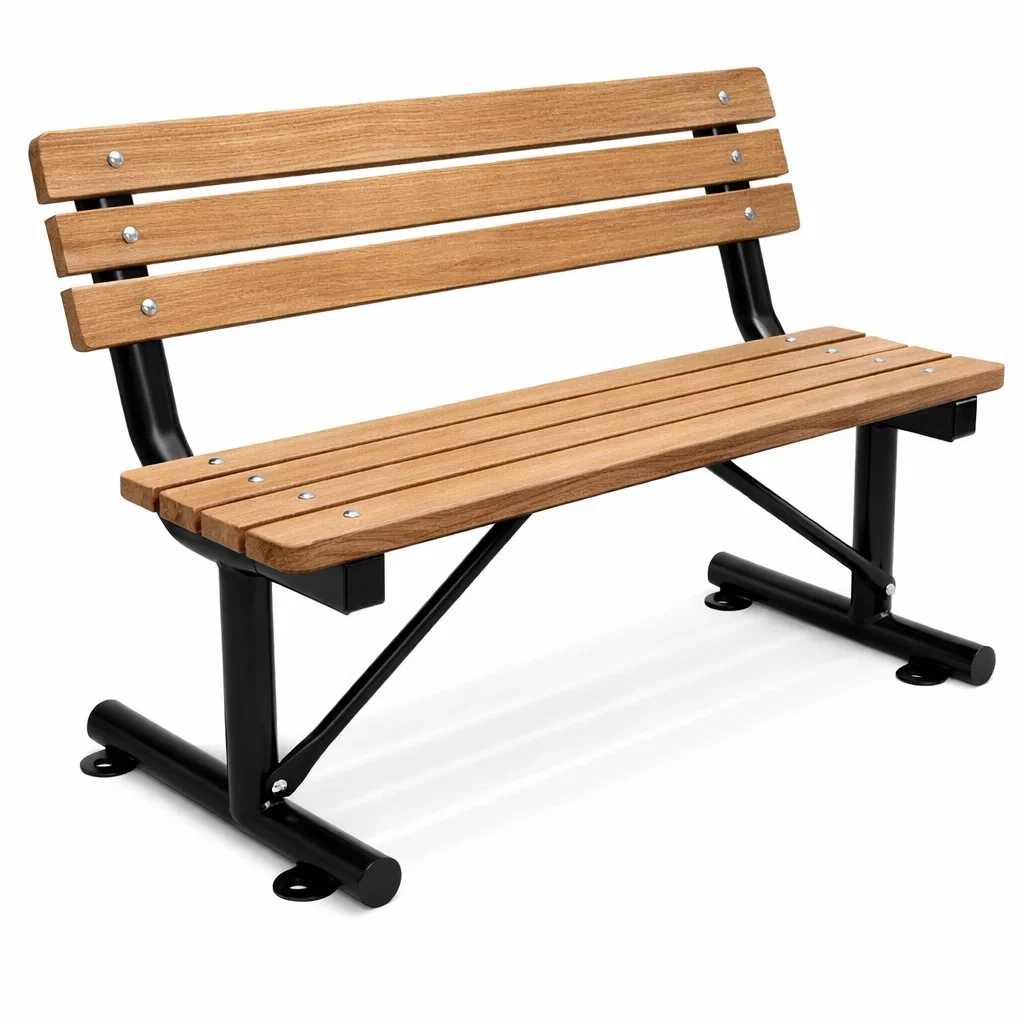 Ce banc est fabriqué avec des planches en bois de pin pour l'assise et le dossier, tandis que la structure est en acier enduit de poudre. Il peut supporter un poids maximal de 250 kg.