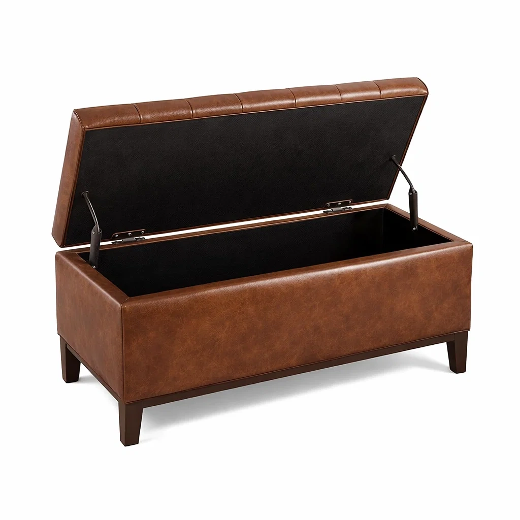 La structure est soutenue par des pieds en bois. Équipé d'un couvercle articulé pour un accès facile, il offre un espace de rangement pratique. Capacité de charge: 100 kg.